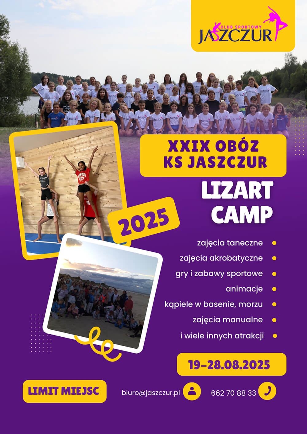 KS Jaszczur już po raz XXX jest organizatorem letniego obozu taneczno-sportowego dla dzieci i młodzieży !!! Jeżeli chcesz, aby Twoje dziecko poprawiło swoją sprawność, aktywnie spędziło 10 dni wakacji oraz udoskonaliło swoje umiejętności taneczne i nie tylko, to Summer LizArt Camp jest strzałem w 10!